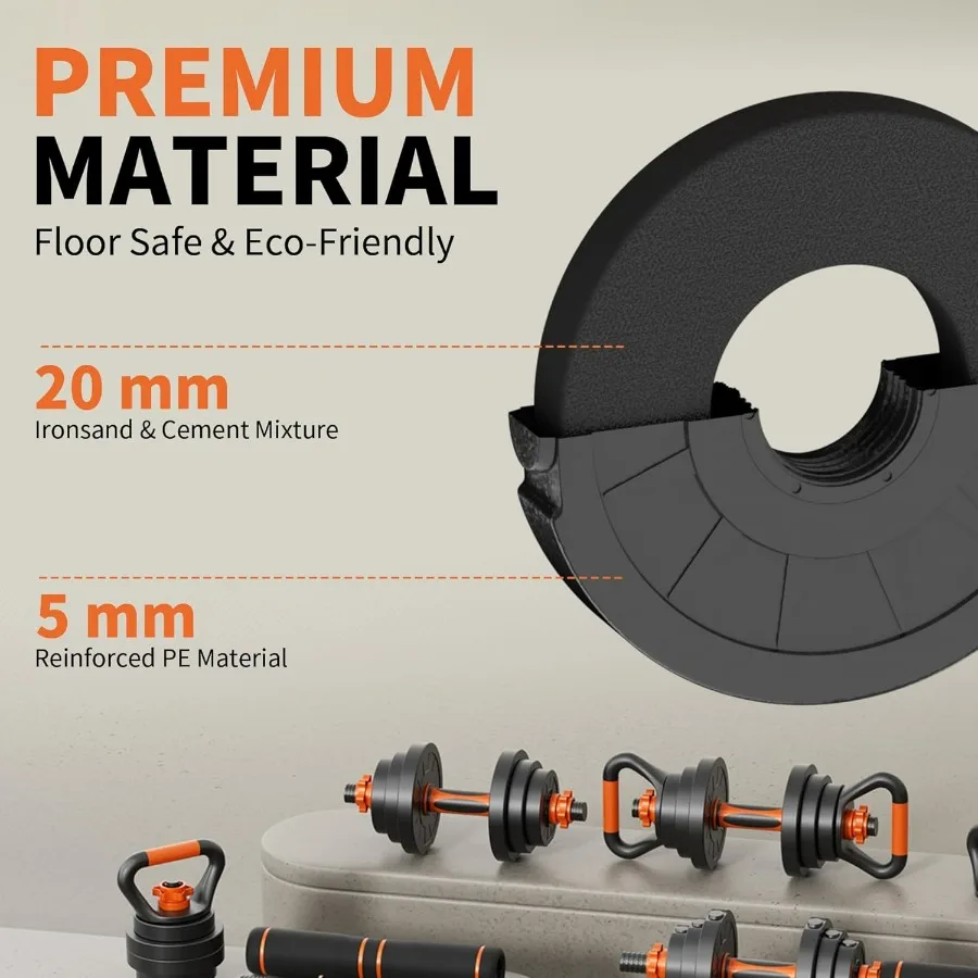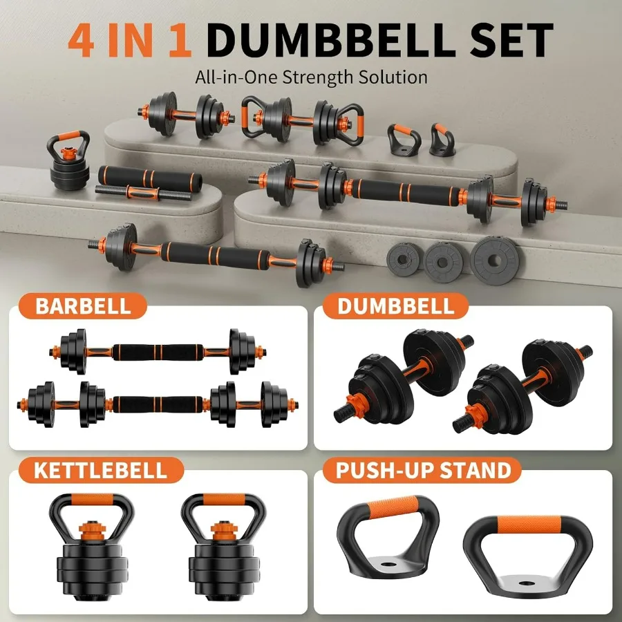 Versatile adjustable dumbbell set converts to barbell, kettlebell, and push-up stand for full-body strength training.